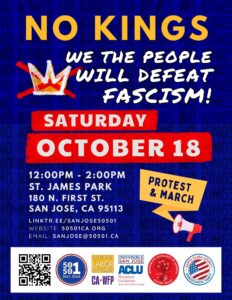 Attendees are asked to bring their own food and water, hat, sunscreen, and signs and to carpool or use mass transportation wherever possible. St. James Park is a 26 minute walk from Caltrain San Jose Diridon Station and is at the St. James Station on the VTA light rail Blue and Green lines. Parking is available on street and at the following nearby parking garages: