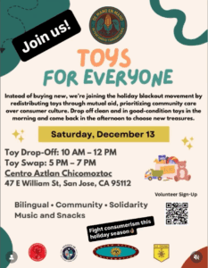 Instead of spending more money, we’re choosing community care over consumer culture. This season, we’re redistributing toys through mutual aid, keeping resources circulating, reducing waste, and making sure every child still gets joy.