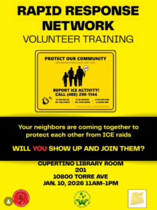 Come join us on January 10 from 11AM to 1PM at the Cupertino Library to learn how to defend your immigrant neighbors from ICE.