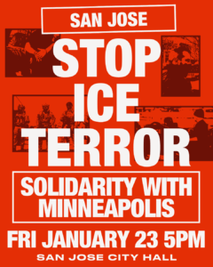 This Friday, San Jose stands in solidarity with Minneapolis, where labor, faith, and community leaders have called for a historic shutdown to demand ICE out, justice for Renee Nicole Good, and an end to all ICE terror. From Minneapolis to San Jose, we refuse to allow Trump, ICE and the U.S. war machine to operate with impunity! We’re taking to the streets to say STOP ICE TERROR! ICE OUT OF OUR COMMUNITIES!