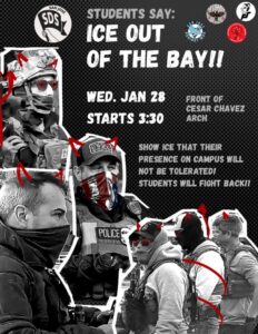 DOWN WITH ICE!  Join us this coming Wednesday 3:30 PM in front of Cesar Chavez Arch.  As ICE murders people in cold blood, abducts our neighbors and threatens to escalate its presence at the Super Bowl here in the bay, we as students must take a stand
