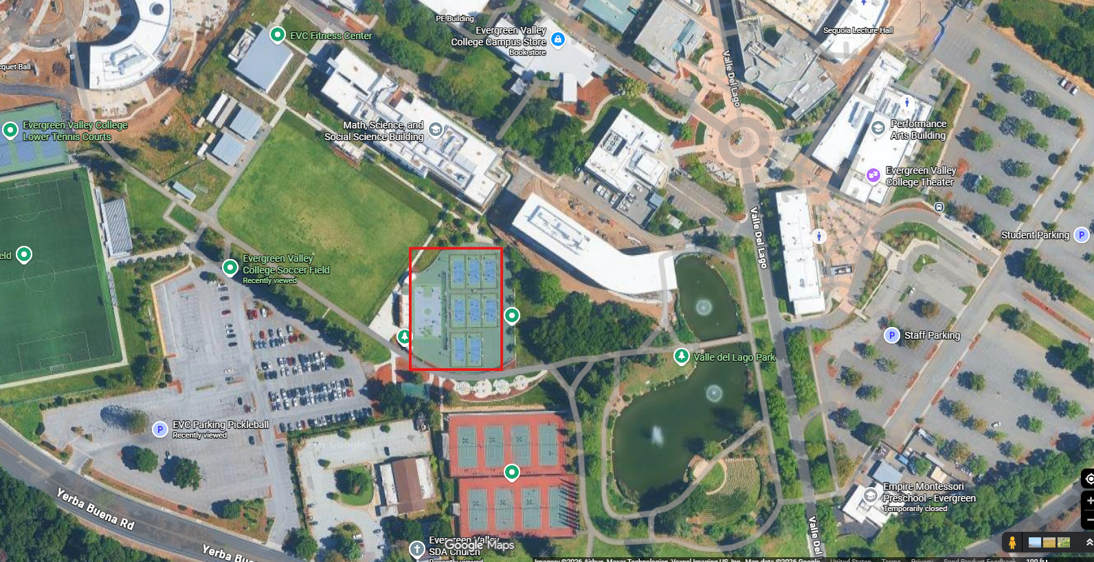 1. Basketball court and pickleball courts in red square. Parking areas, tennis courts, field, and flat walking/running space.